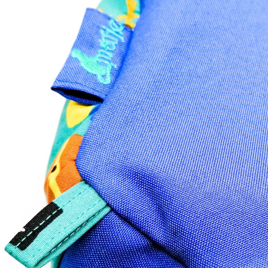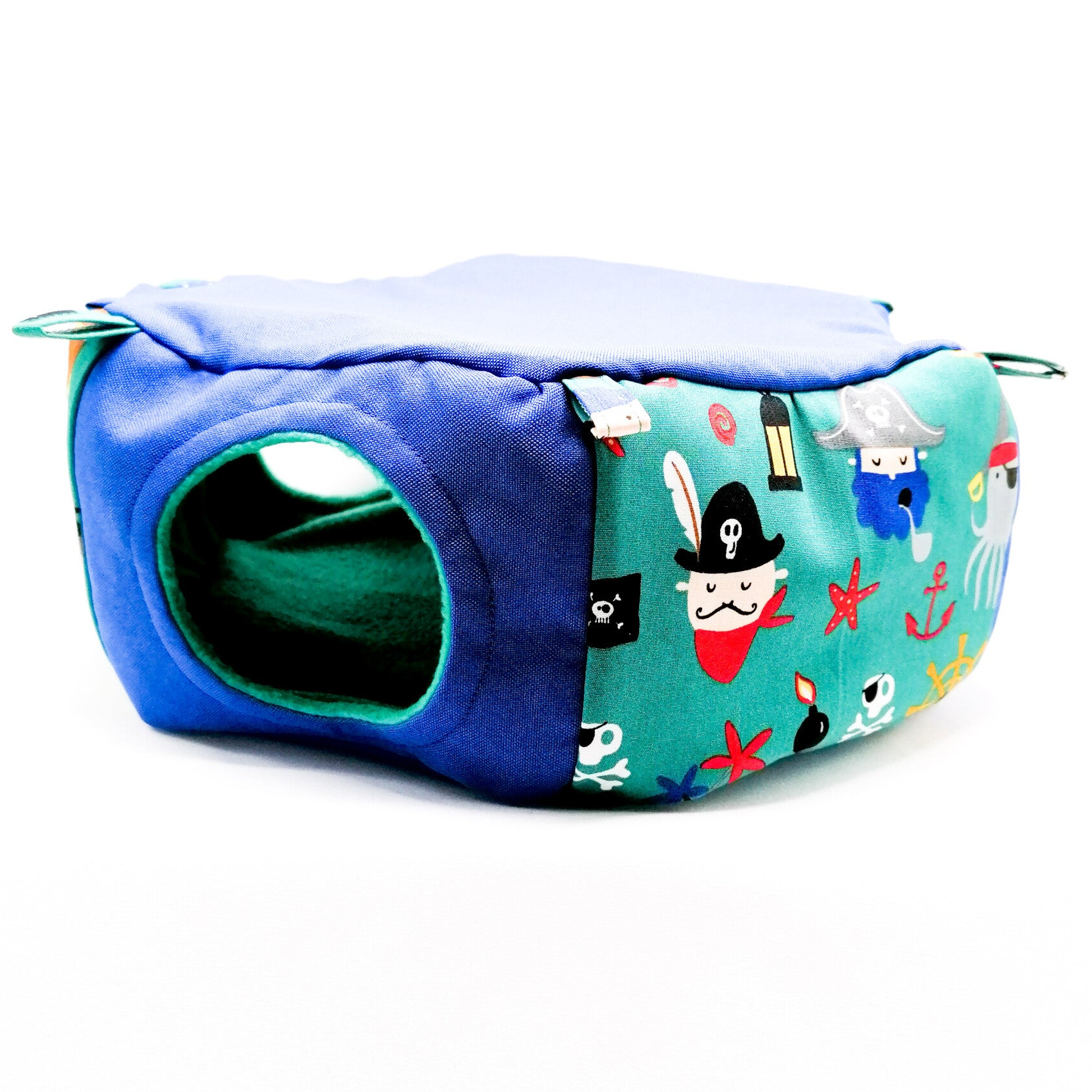 Buitenzijde (zijkant) groen met piraten thema gecombineerd met blauwe effen stof.