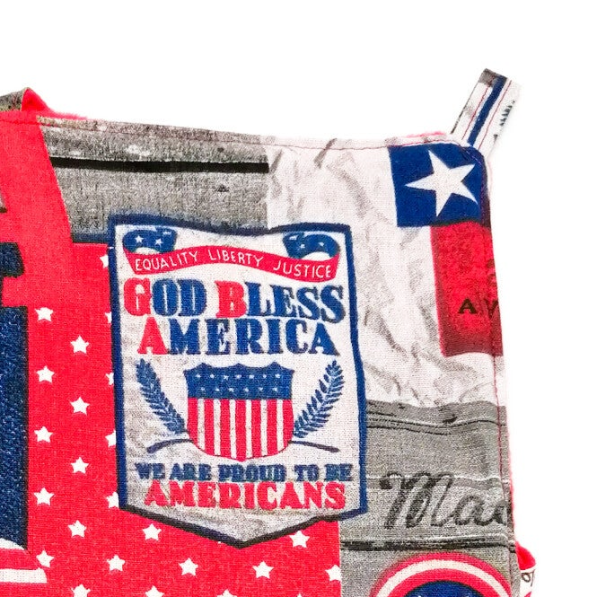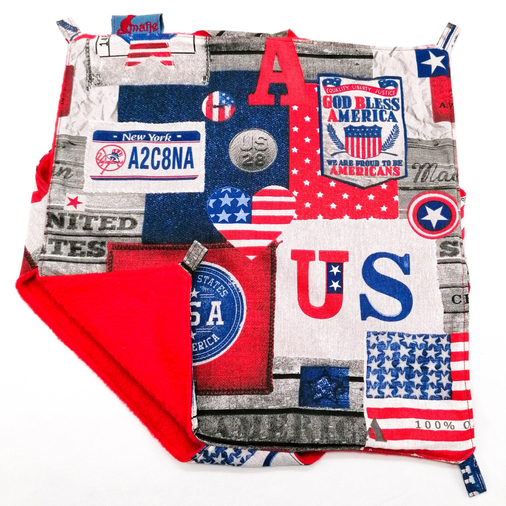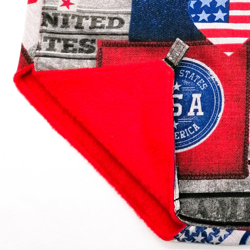 Buitenkant: grijs, jeansblauw en rood met USA print