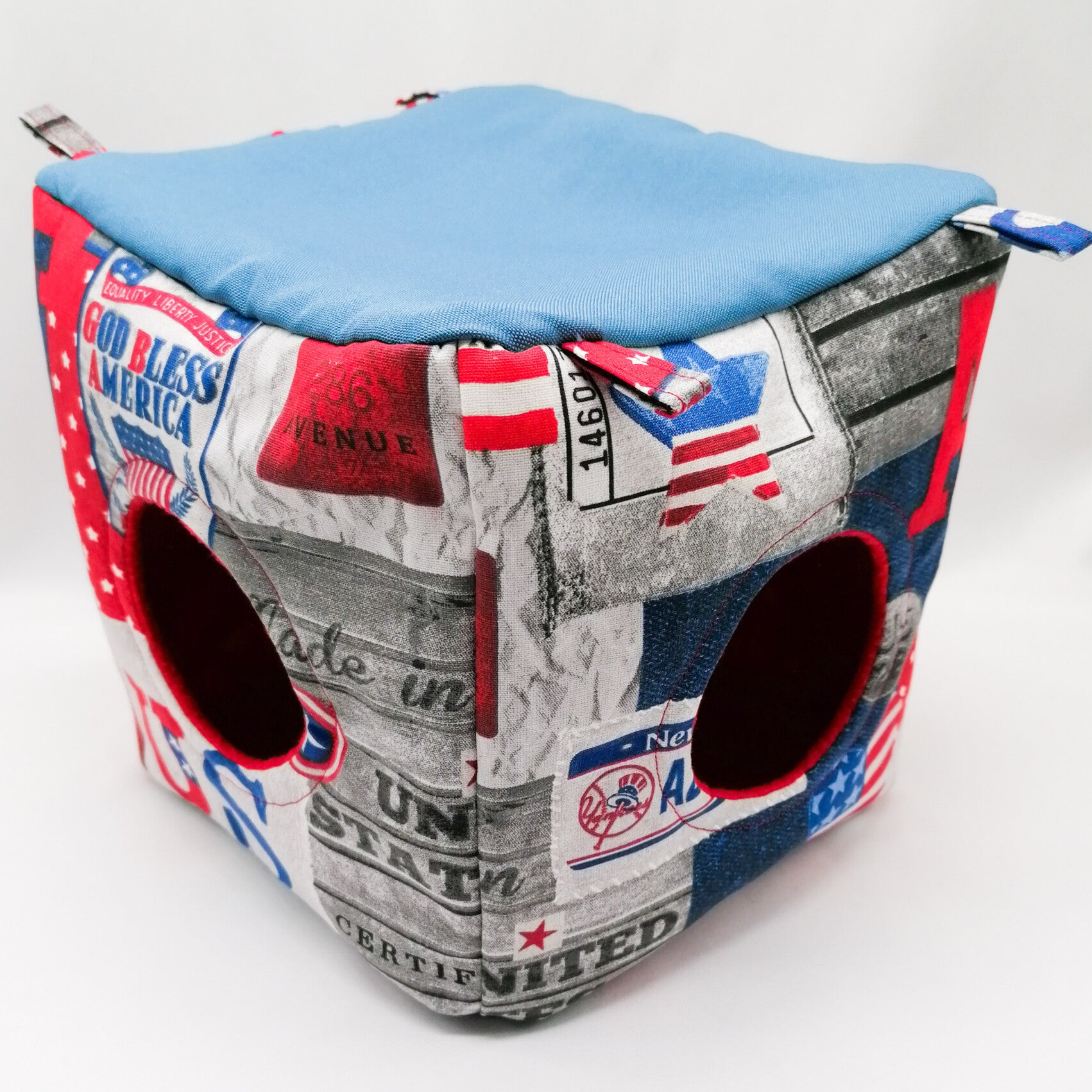 Kubus met 2 openingen en 4 stevige ophanglusjes van stof.