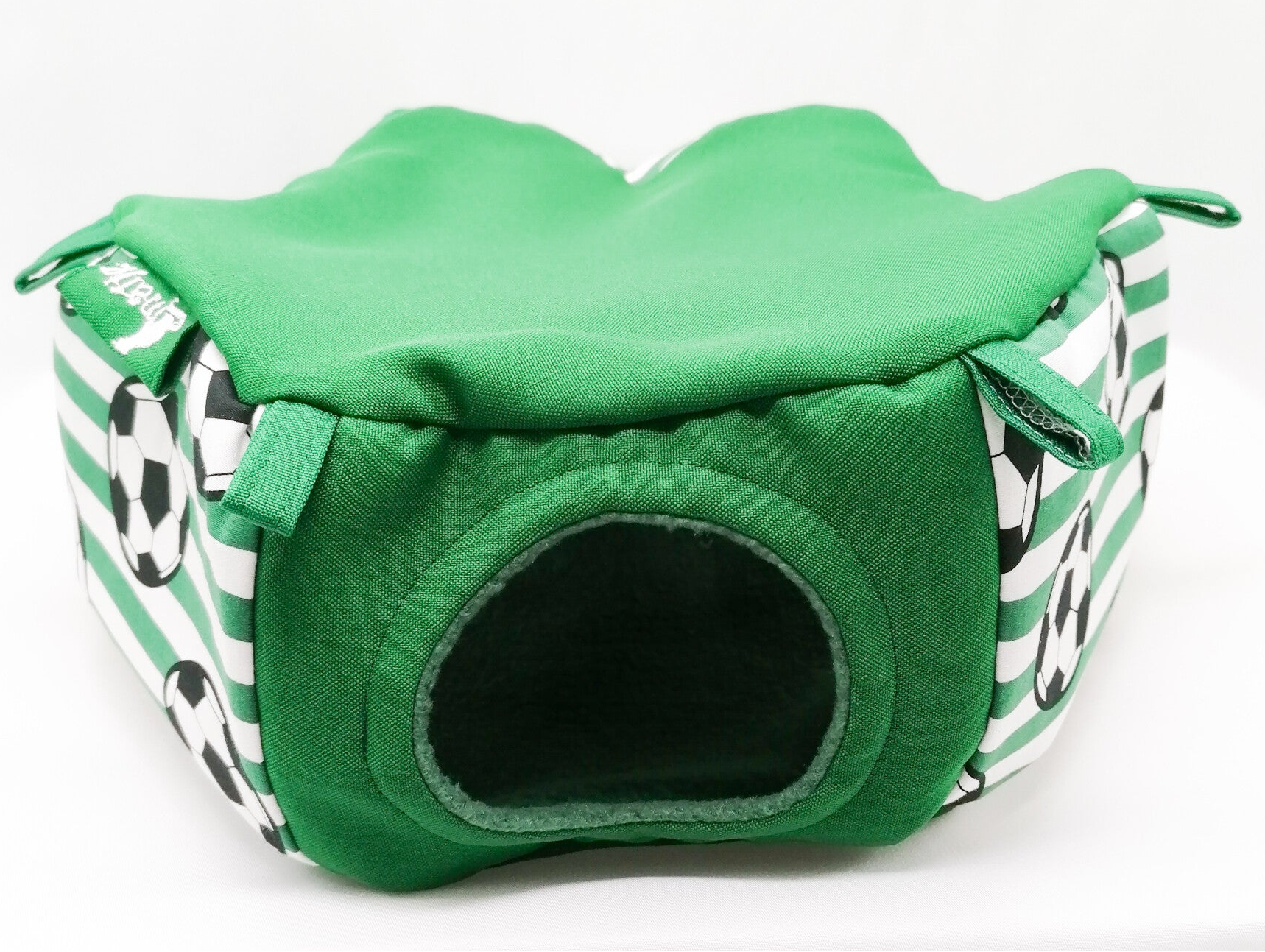 Zeskant huisje met 3 ingangen wit / groen gestreept met voetballen
