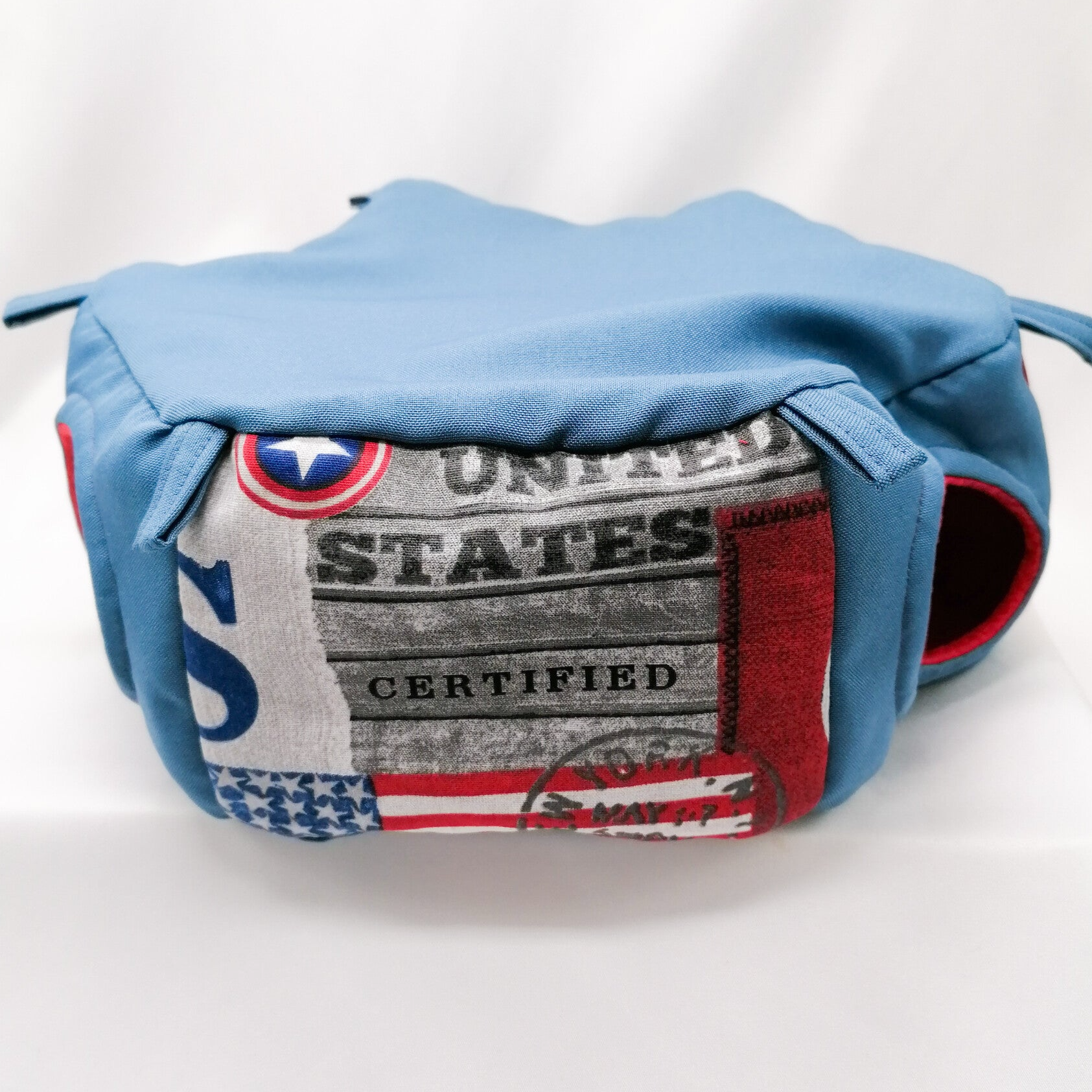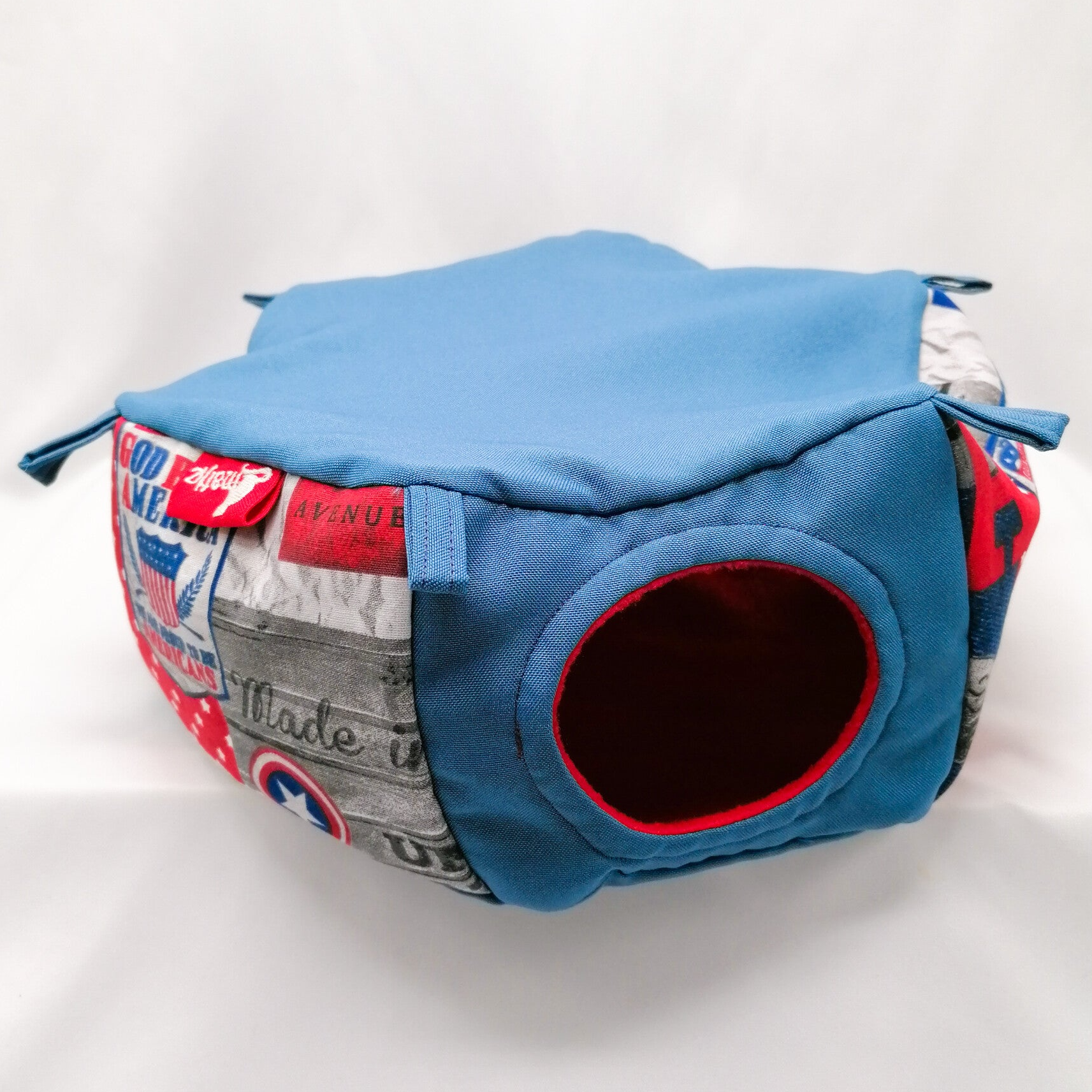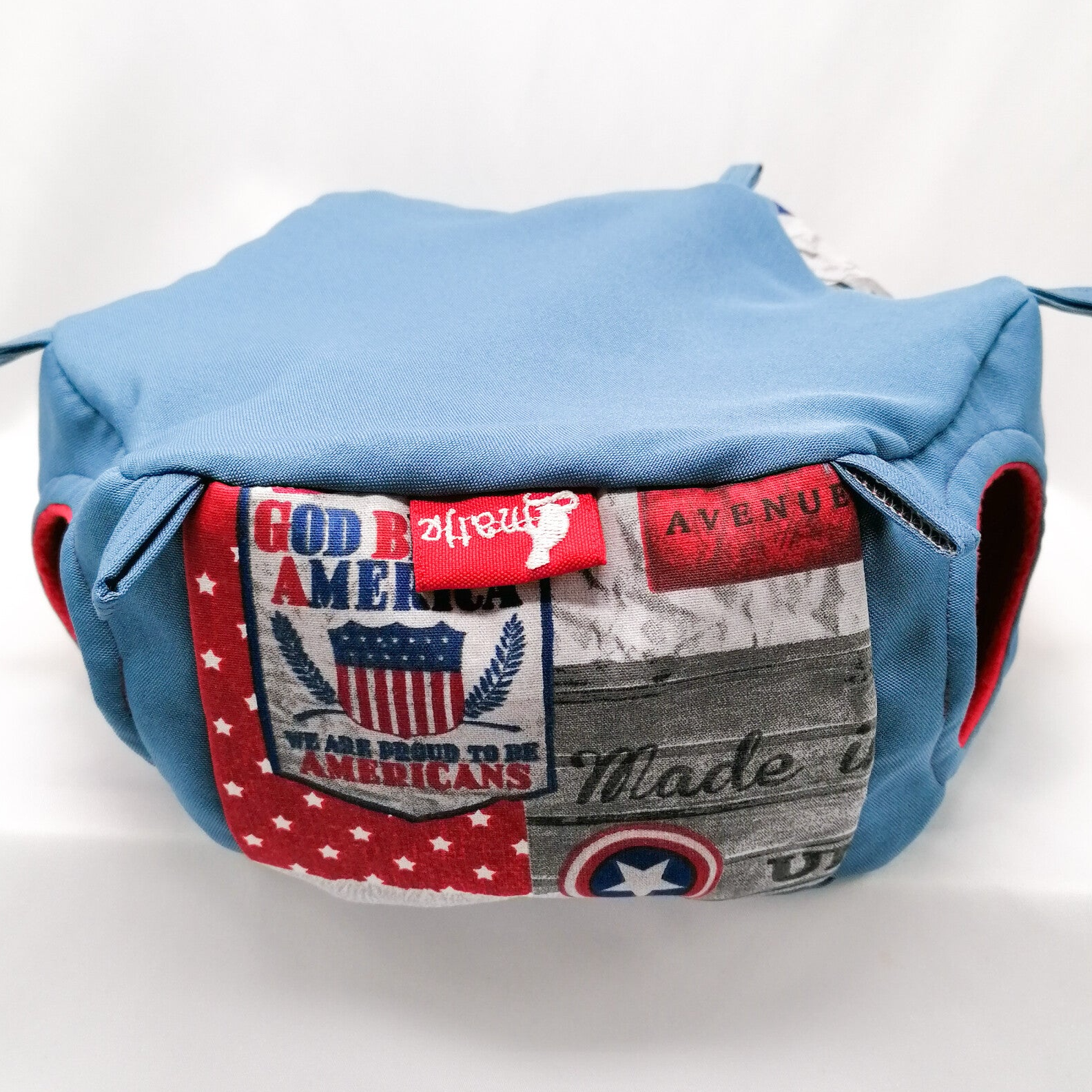 Buitenzijde (zijkant) USA print gecombineerd met jeanskleurige effen stof.