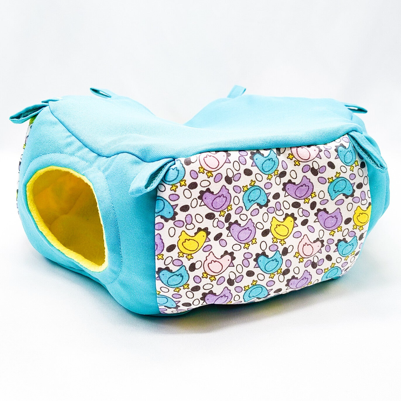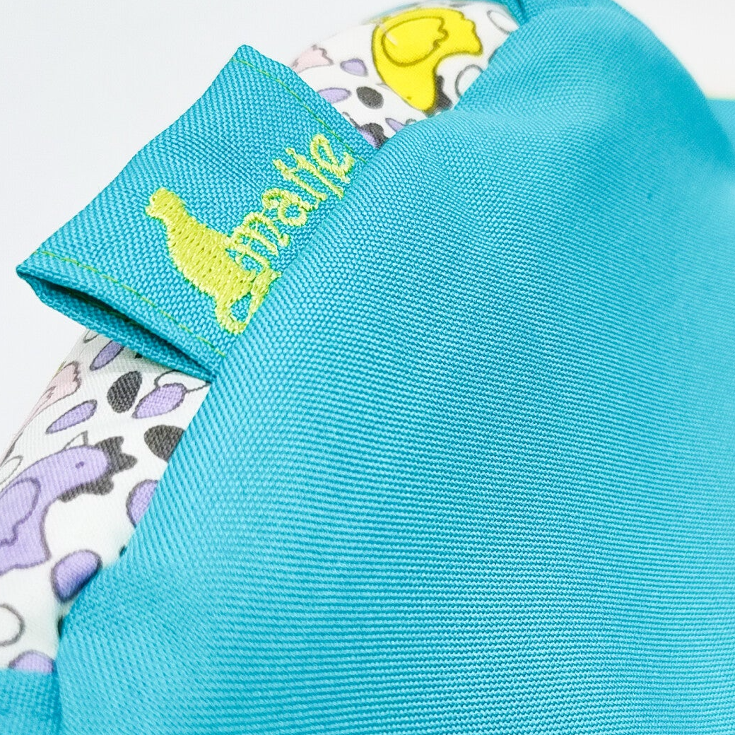 Buitenzijde (zijkant) wit met gele, aqua en lila kippen en aquakleurige effen stof.