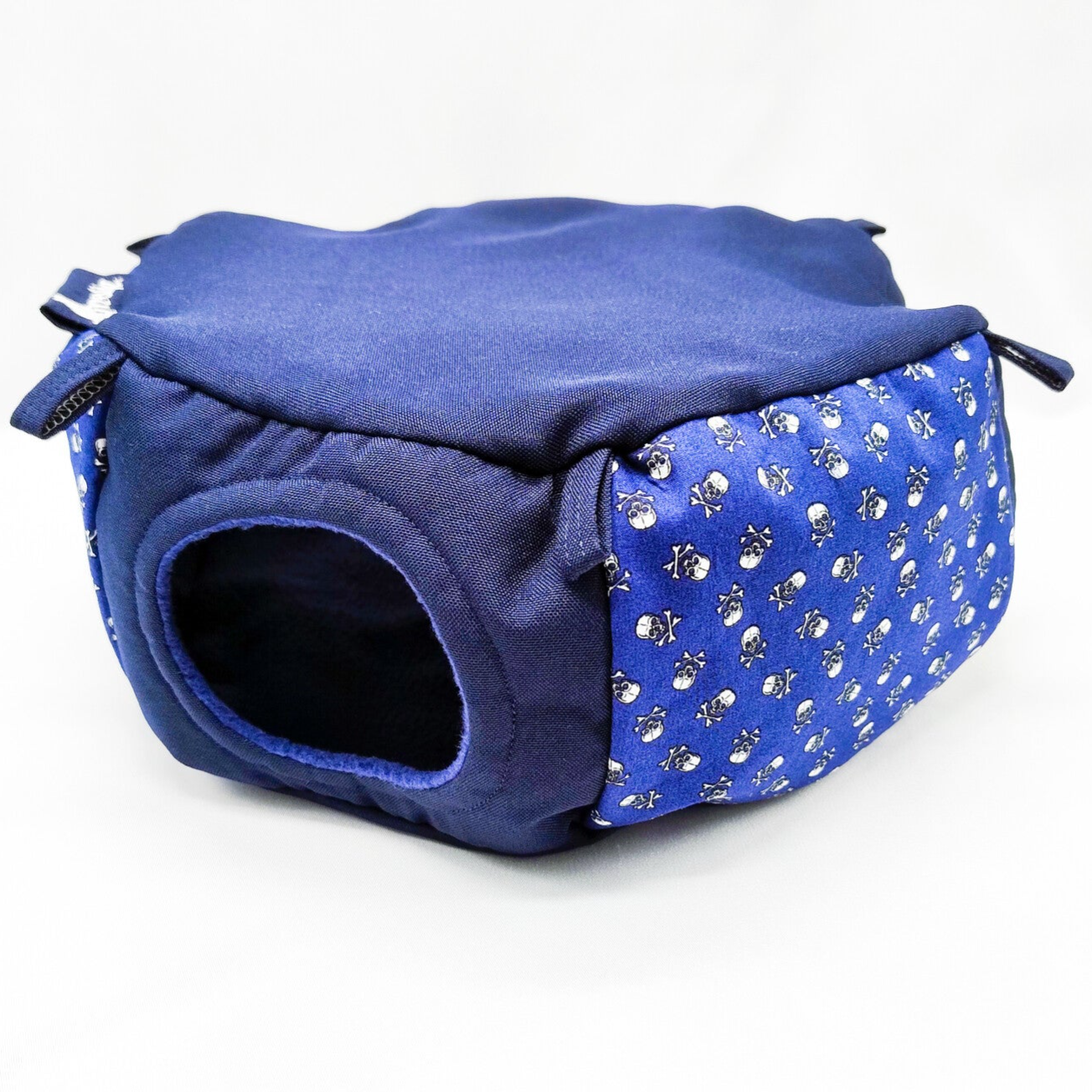 Buitenzijde (zijkant) donkerblauw met doodshoofden met donkerblauwe effen stof.