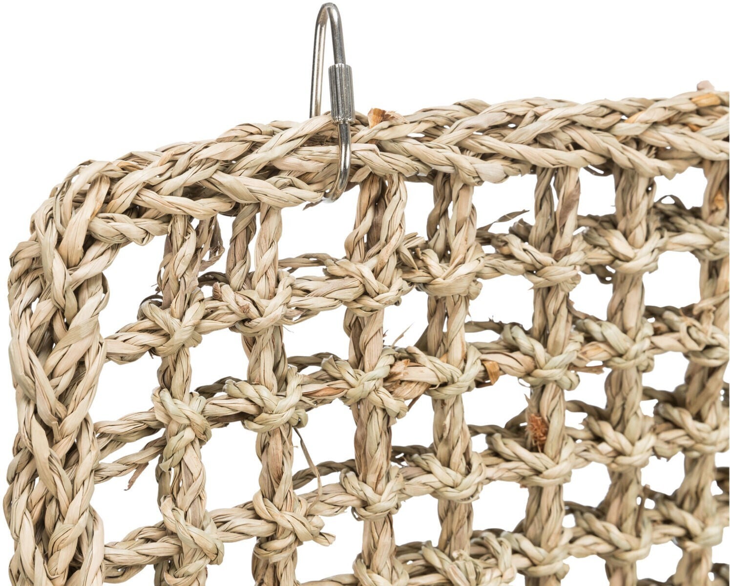 Deze klimmat van zeegras kan  aan de tralies gehangen worden van de kooi dankzij de karabijnhaak. Leuk om mee te spelen en om verveling tegen te gaan.u
