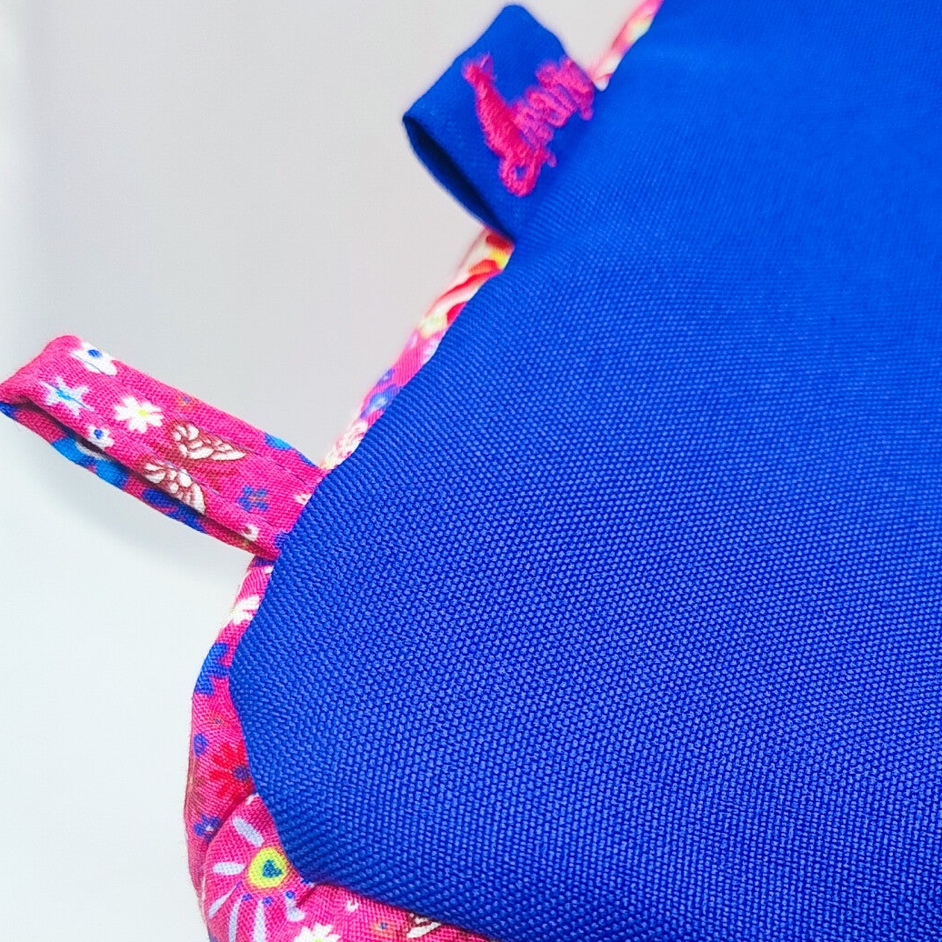 Buitenzijde (zijkant) : stof roze met blauwe bloemen is verstevigd met plakkatoen.