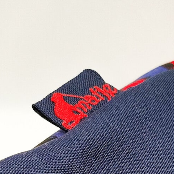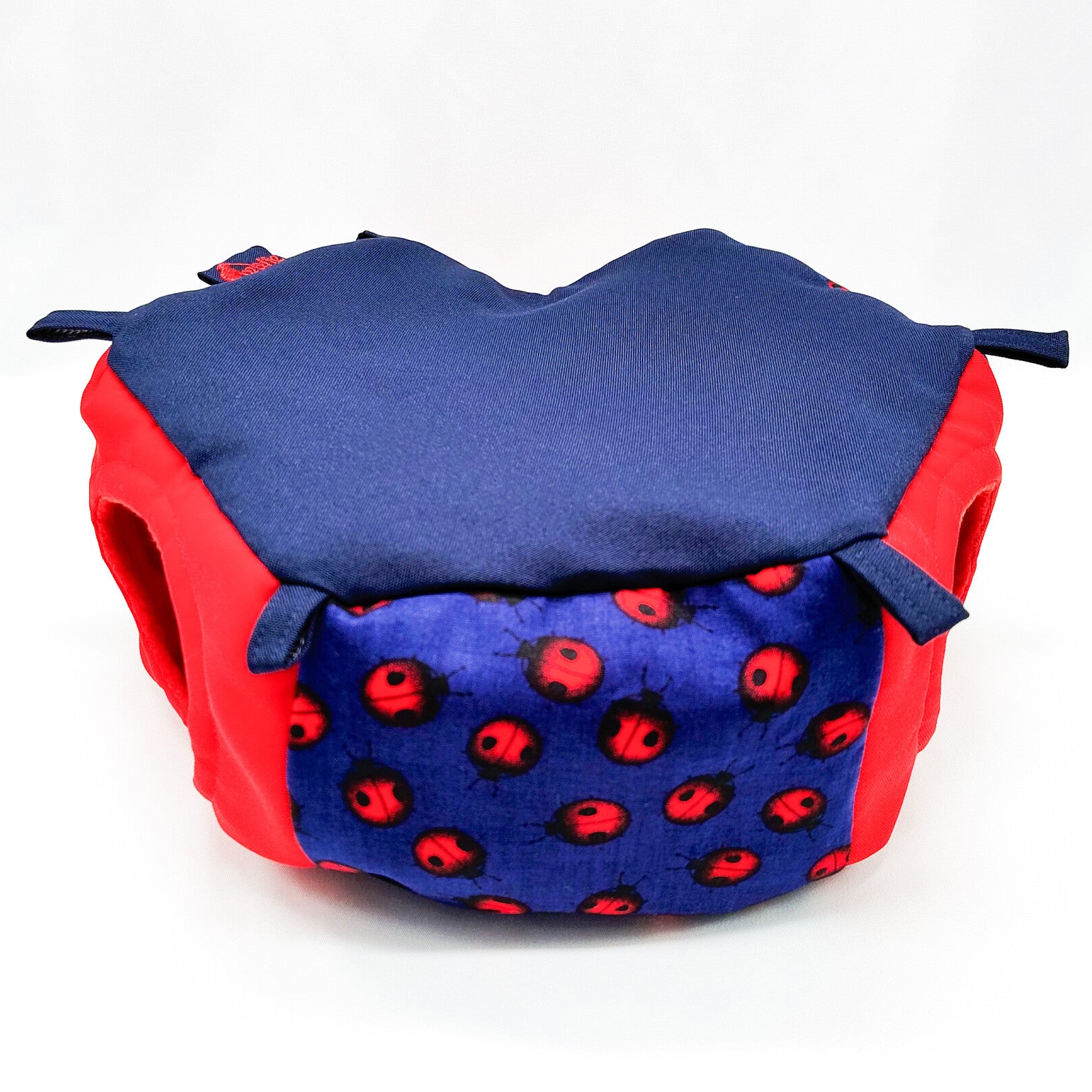 Buitenzijde (zijkant) donkerblauw met lieveheersbeestjes, gecombineerd met rode effen stof.