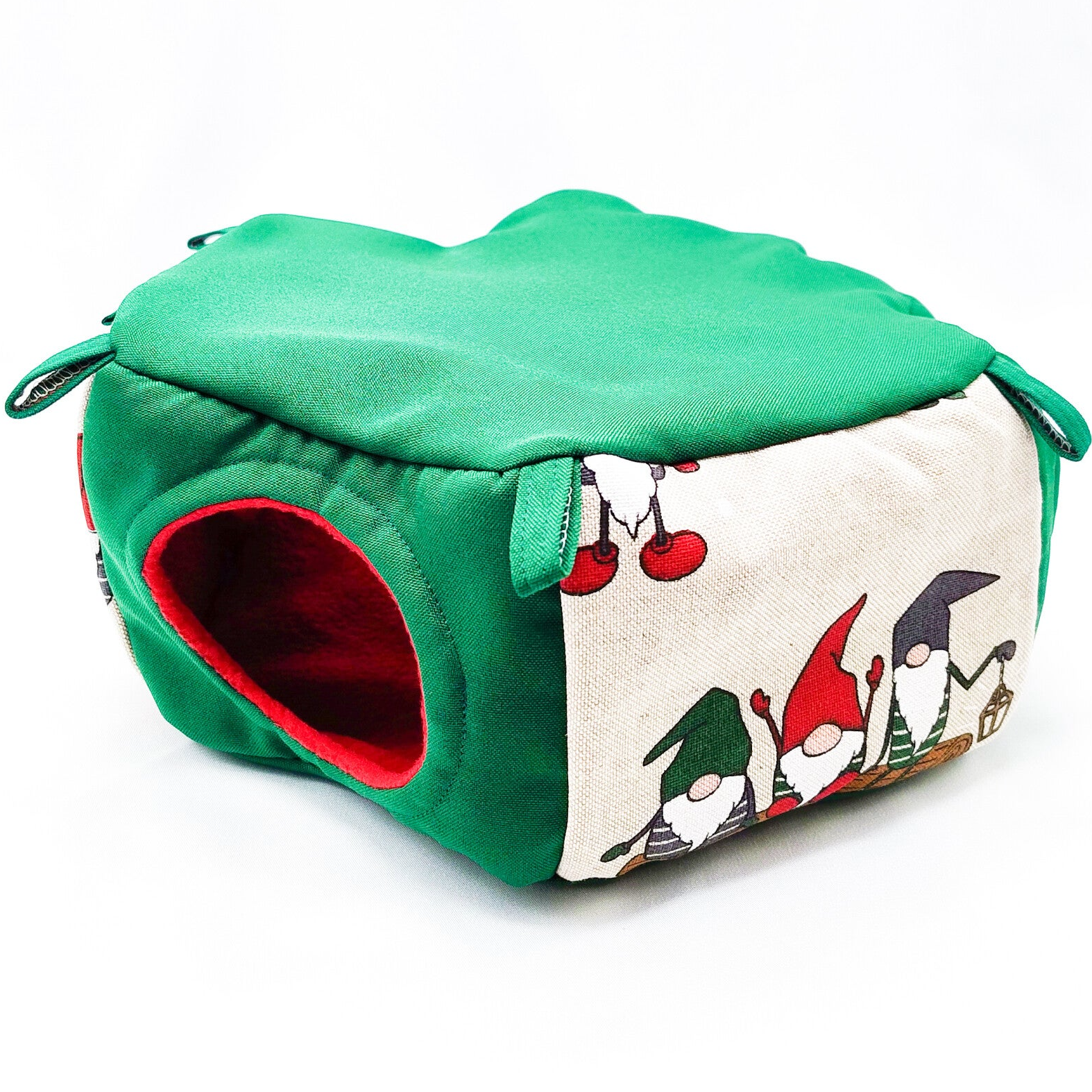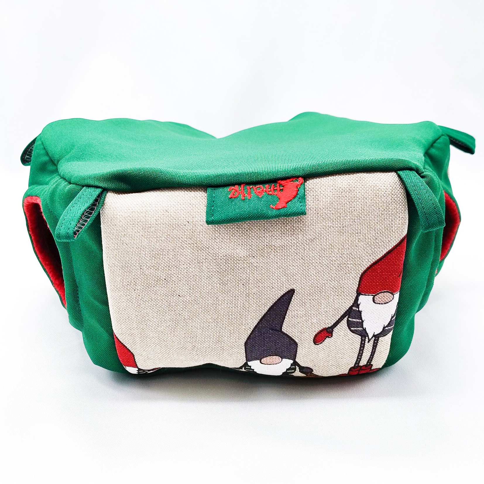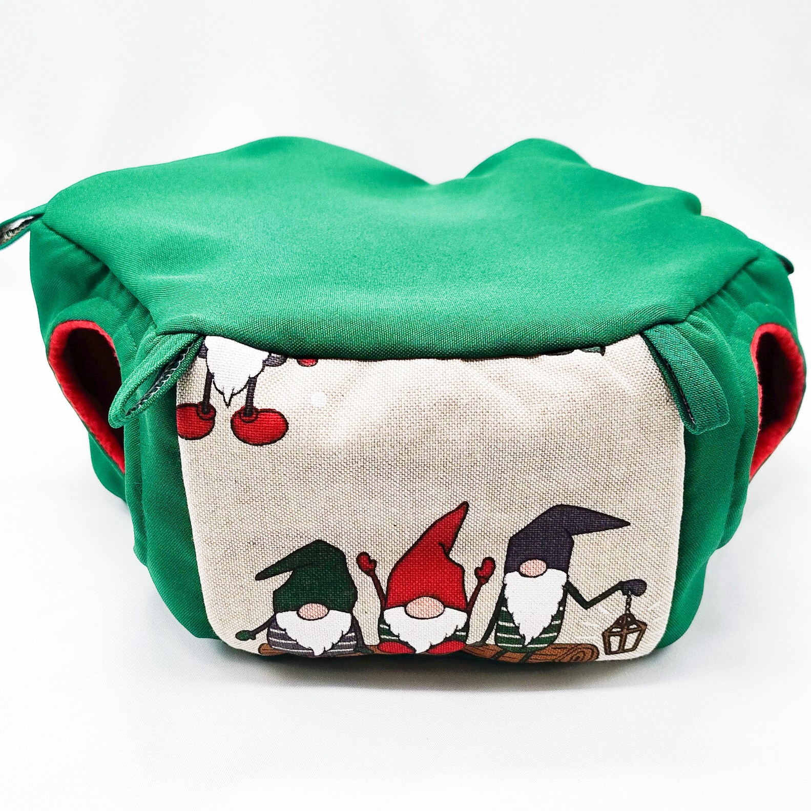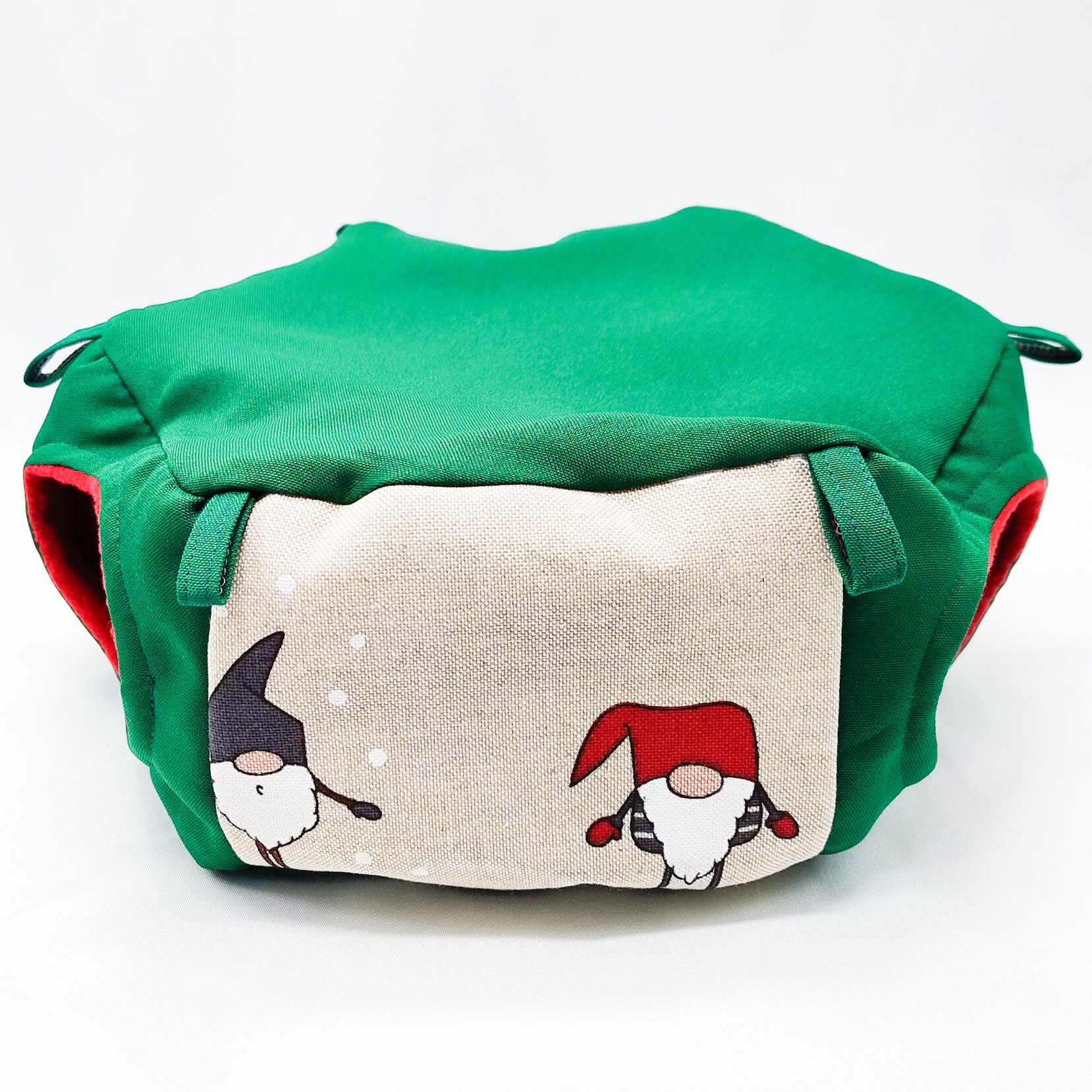 Buitenzijde (zijkant) ecru met kerstgnomen gecombineerd met groene effen stof.