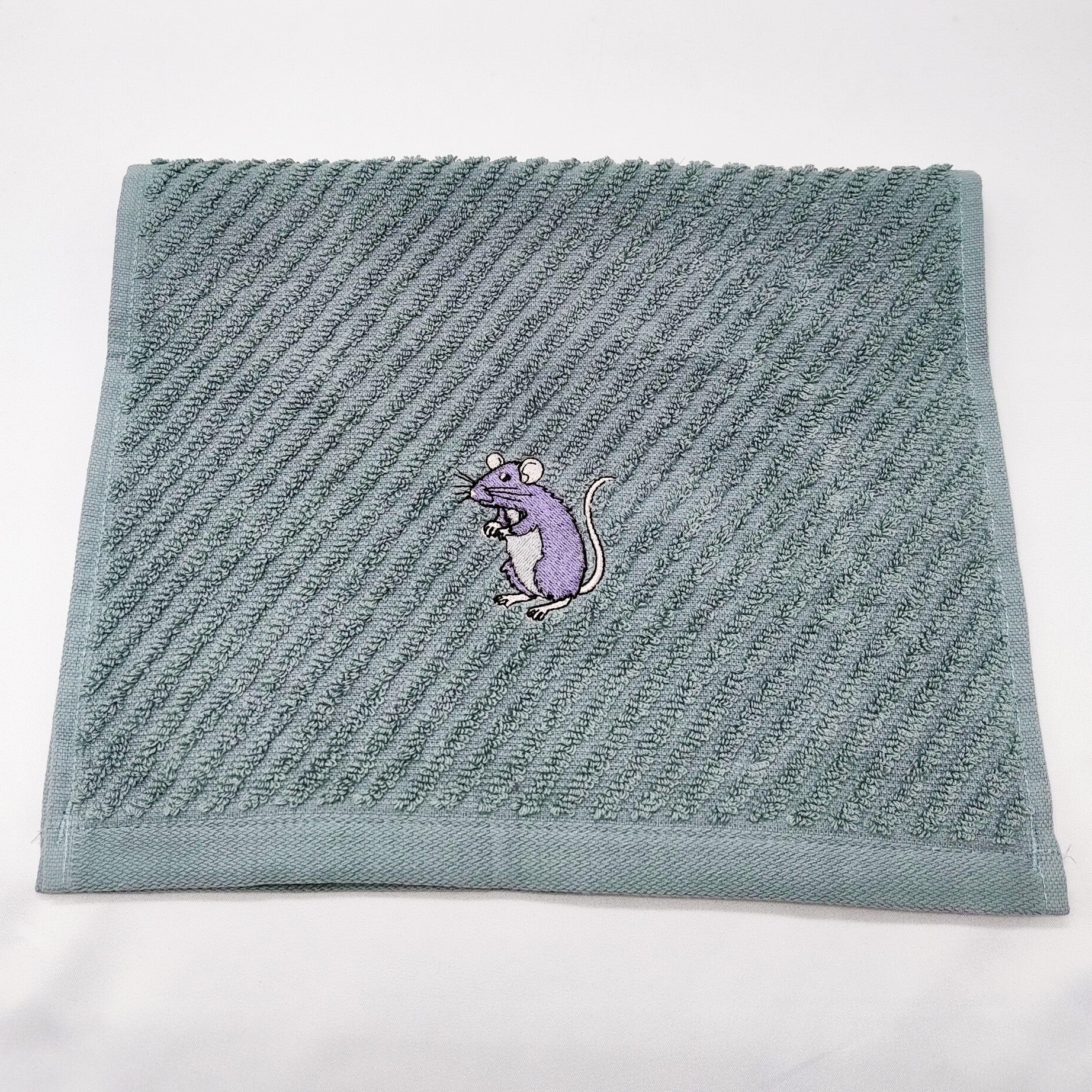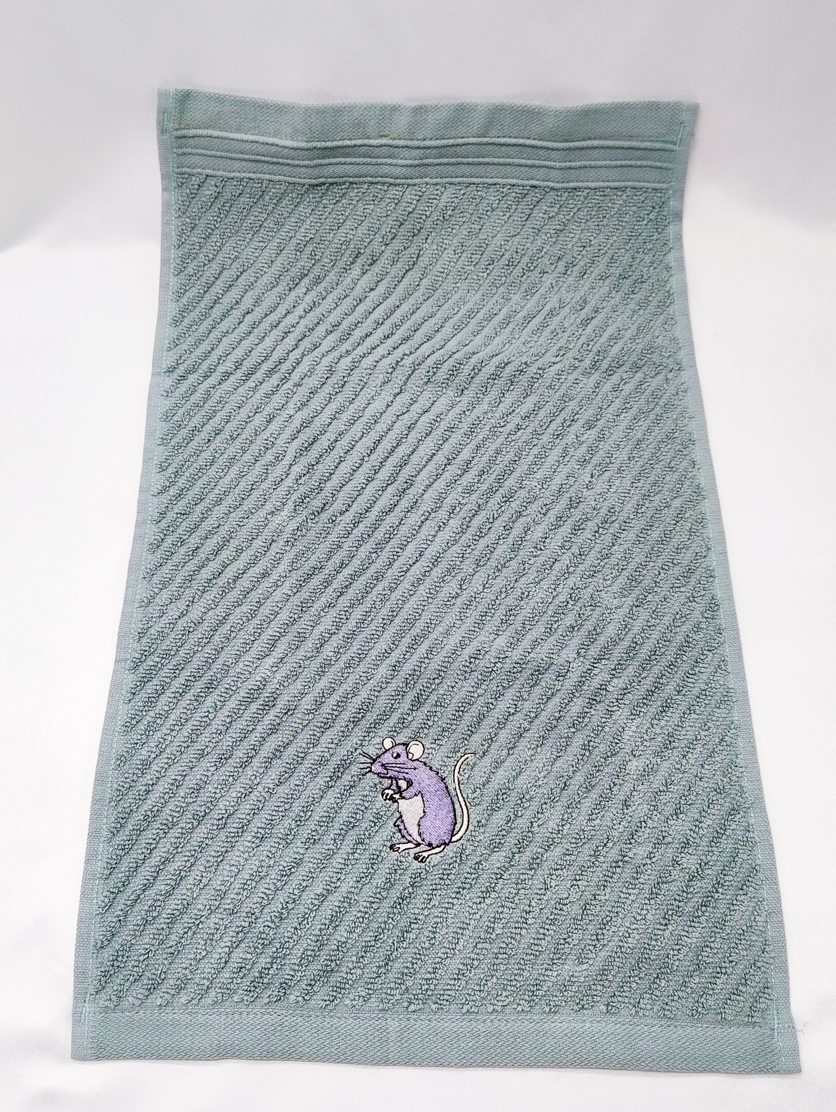 Oud groen gastendoekje met Russisch blauwe (grijze) geborduurde rat.