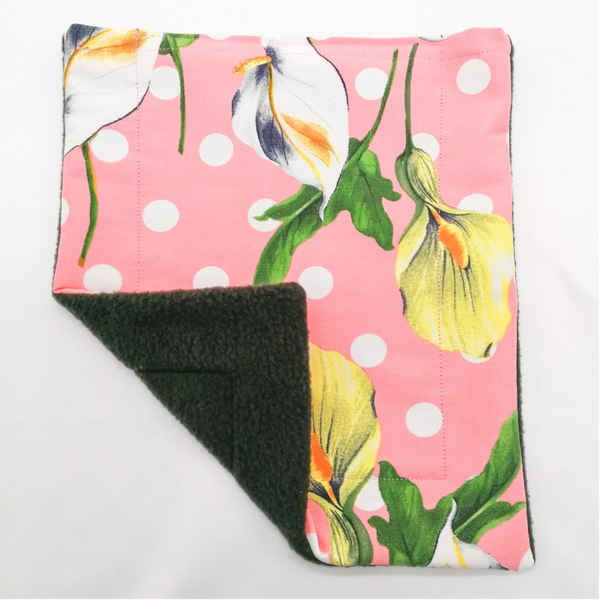 Radiatorhangmatje roze met witte stippen, bloemenmotief, gecombineerd met grijze Fleece stof.